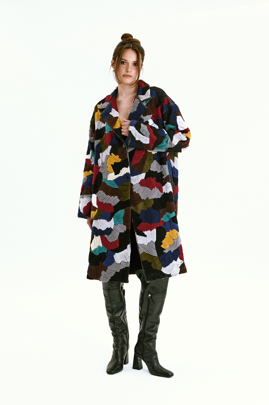Markanın imza el işçiliğini taşıyan bu oversize kaban, koleksiyonun öne çıkan parçalarından biri. Tamamı kadın zanaatkârlar tarafından elde işlenen iplik aplikeler, yün içerikli zemin üzerinde katmanlı ve sanatsal bir yüzey oluşturur. Her bir renk geçişi ve doku, uzun ve titiz bir üretim sürecinin sonucudur.