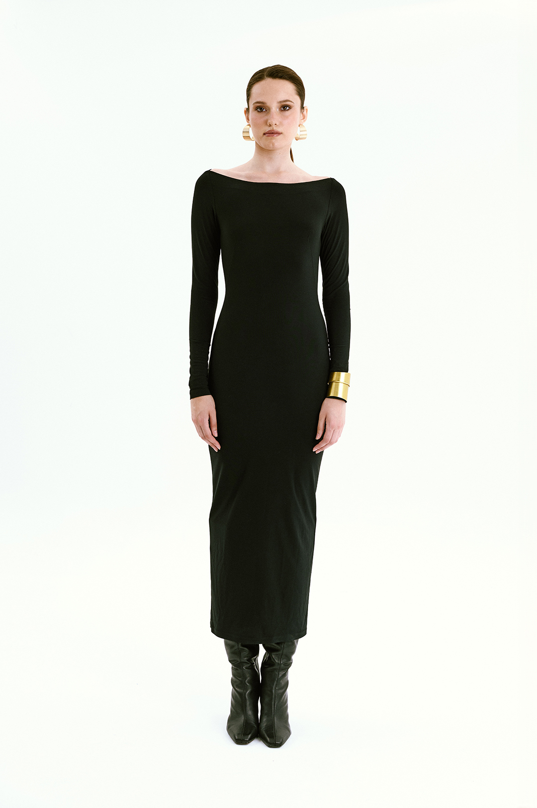 Kayık Yaka Sırtı Açık Uzun Kollu Siyah Kalem Elbise